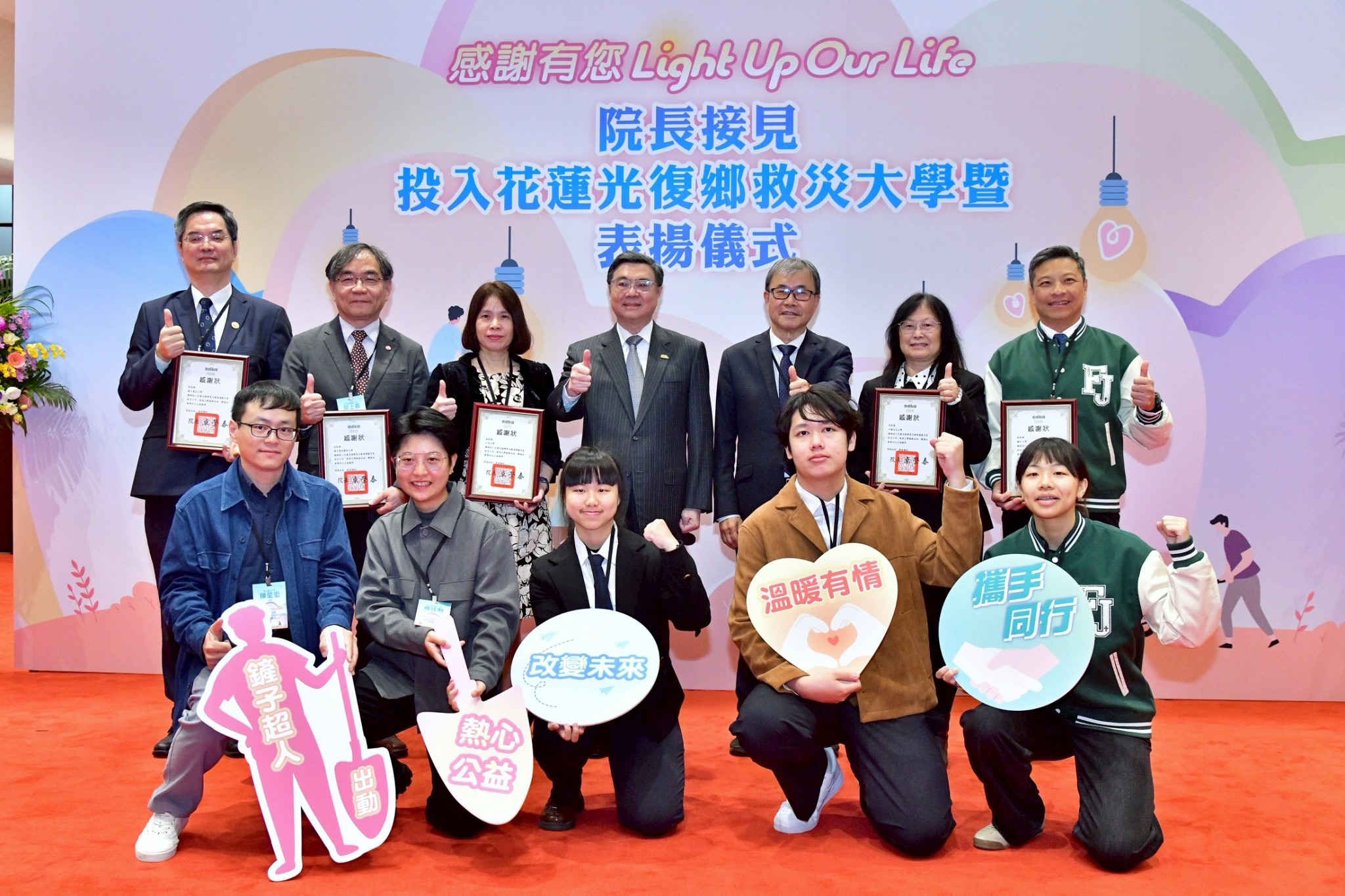 行政院長卓榮泰今(26)日接見投入花蓮光復鄉救災大學暨表揚儀式「感謝有您·Light Up Our Life」。院長感謝去(114)年9月全臺30所大學師生化身「鏟子超人」,投入馬太鞍溪......【詳全文】