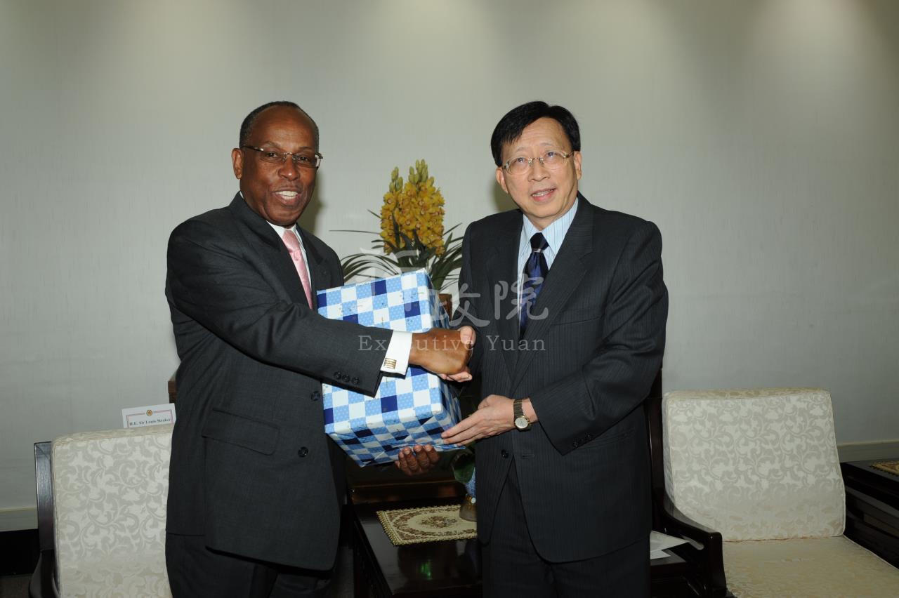 行政院院長劉兆玄今(27)日上午接見由聖文森副總理兼外長史垂克爵士(Sir Louis Straker)夫婦及聖國觀光部長畢克(Hon. Glen Beache)夫婦。劉院長強調,我國將持續增進與聖文森長久以來堅固的友誼,並藉由加強兩國友好及緊密的聯繫,鞏固雙方邦誼及促進彼此的交流與合作。