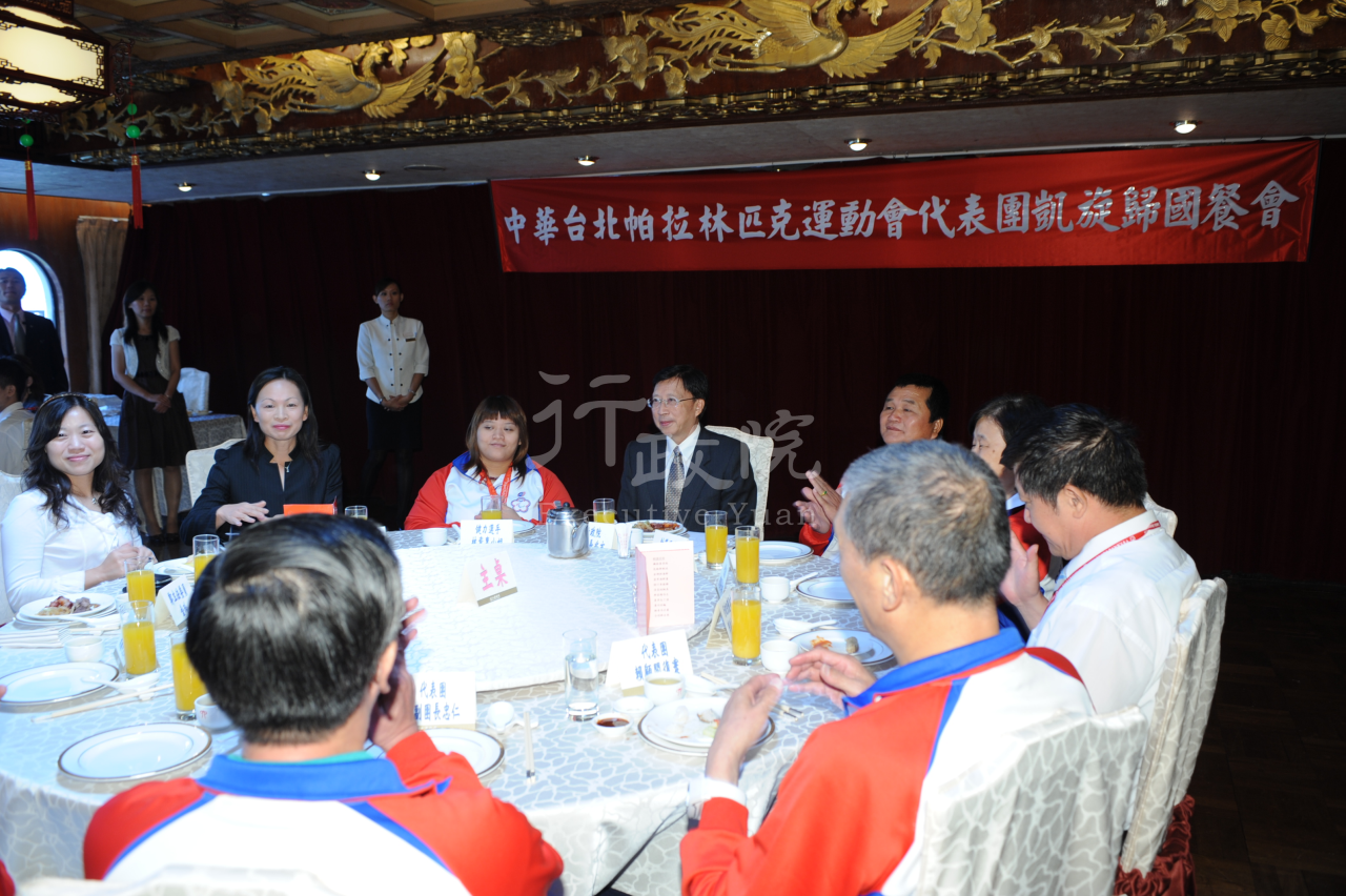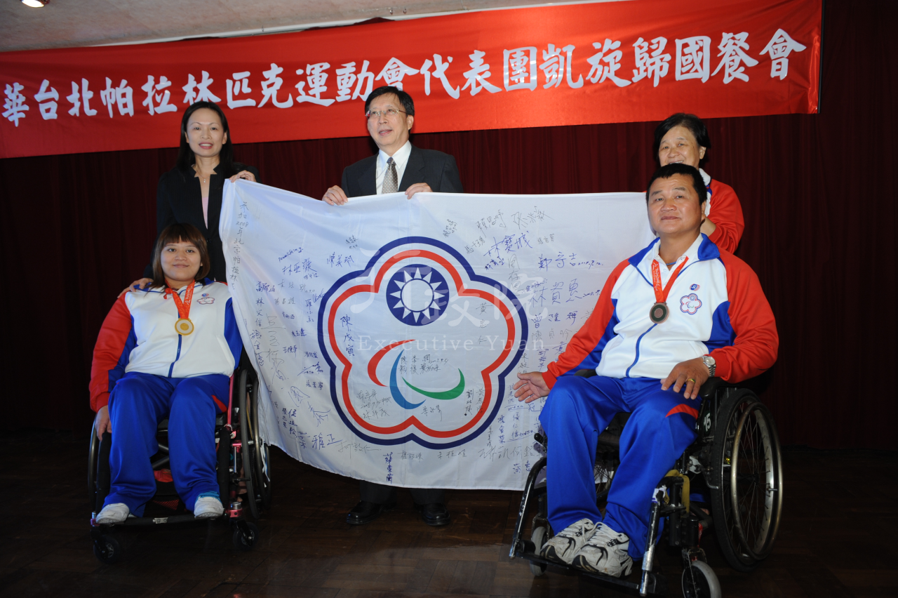 行政院長劉兆玄今(19)日在出席「2008北京帕拉林匹克運動會」代表團返國歡迎餐會中,代表政府歡迎代表團載譽歸國,此次中華代表團在北京「帕運會」6個項目中,經過11天激烈的競賽,獲得1面金牌及1面銅牌的成績,在世界各國身心障礙者競技實力與日俱增,奪牌難度增加的情形下,能得到這樣的成績,實屬難得,令國人與有榮焉。