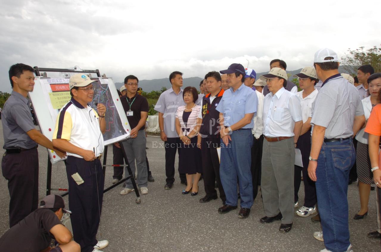 劉院長隨後也前往鳳林鎮中興埔地區視察西瓜受損災情,並到壽豐鄉實地暸解樹湖溪淹水情形及整治方案。劉院長說,樹湖溪治理工程在97-98年度已編列9800萬元預算,他指示縣政府訂定時間表,務必在明年汛期前完工。劉院長強調,花蓮地區在8年800億元的治水專案經費中也有5億多元的預算,已編列的預算絕不能挪用它處,要一次將治水計畫做好,除了吉利橋附近48平方公里的集水區外,整體的治水工程都要依照原設計持續做,在98年汛期前完成,以免民眾再受水患之苦。