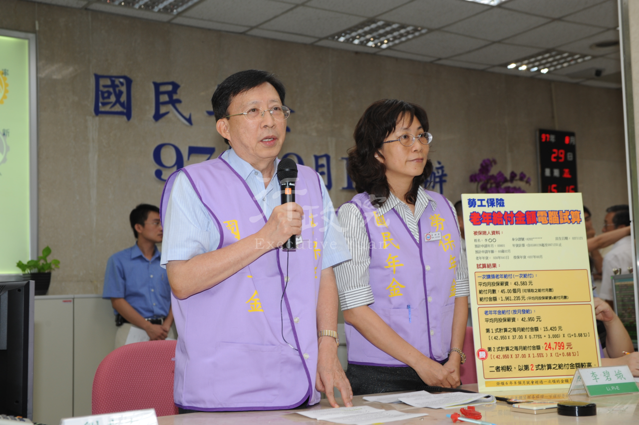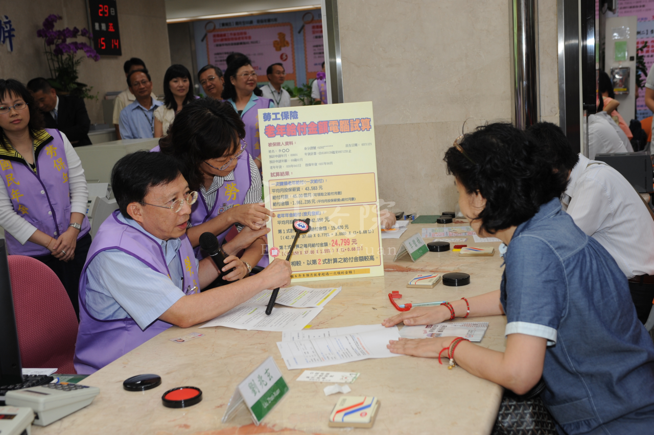 行政院長劉兆玄今天下午在勞工保險局一樓服務櫃台穿起志工背心為民眾服務,宣導正式啟用的「勞保老年給付金額臨櫃試算」查詢系統。劉揆表示,給勞工朋友一個有尊嚴的老年,是政府竭力落實的目標,也是多年來大家努力的成果,勞保年金的施行,正是政府實現照顧勞工朋友的承諾。