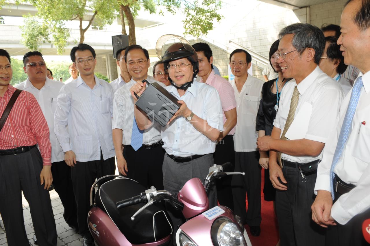 行政院長院劉兆玄今(15)日下午赴工研院視察時表示,工研院所研發的電動機車不僅符合政府節能減碳政策,也十分符合台灣都會區交通特別的情況及需求,是非常值得鼓勵的產品,若能與民間合作推廣成功,台灣的街道將沒有噪音、沒有廢氣,他希望這款電動機車能在4年內推廣達10萬輛。 劉院長表示,隨著近年來地球暖化及國際原油價格高漲,節能減碳已成為各國重要議題,因此,行政院日前宣布四年內要推動全國計程車全面改用瓦斯,以及推廣可抽換電池之電動機車,預計四年內達十萬輛的政策。 劉院長除聽取工研院簡報外,並參觀「先進潔能電動機車」展示,同時也試乘可抽換電池電動機車e-Mio。該款機車內部動力元件全部為電動,搭配可抽取式鋰電池,無論極速或爬坡力,性能均不亞於50CC同型機車,由於電池可抽出攜回家裡或在辦公室內充電,大大提昇了電動機車的推廣空間。 今日陪同劉院長視察工研院的有行政院秘書長薛香川、政務委員張進福、朱雲鵬、研考會主委江宜樺、經濟部次長謝發達等人。