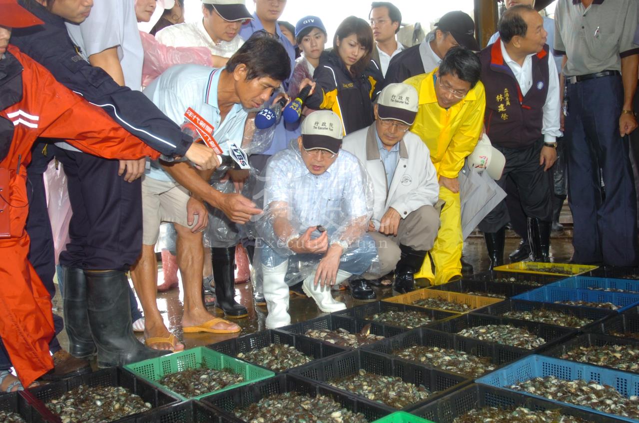 劉院長稍早在礁溪鄉視察大塭養殖漁業生產區災害時表示,對於養殖業者因為瞬間豪雨導致養殖池鹹水淡化、水質污濁惡化,造成養殖九孔等水產死亡的受災情形,請相關單位研議改進方案,提報所需經費列入98年度預算。