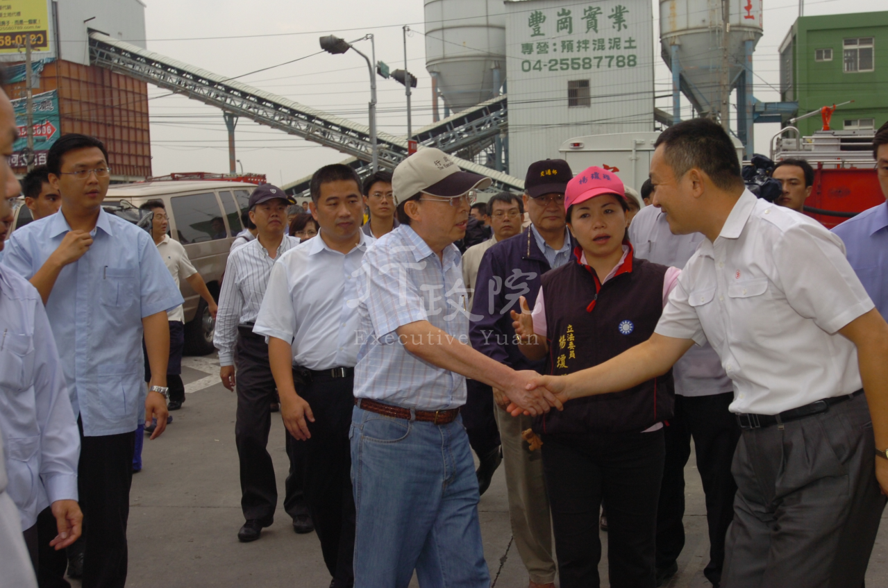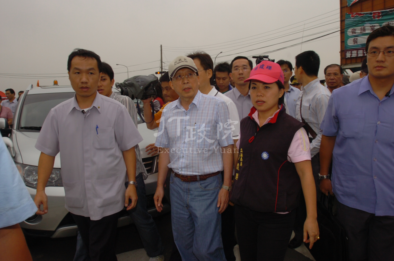 今日陪同院長視察除了交通部長毛治國及水利署長陳伸賢外,還有新聞局長史亞平、研考會主任秘書施宗英及台中縣長黃仲生等人。另行政院相關首長今日勘災視察行程如附。