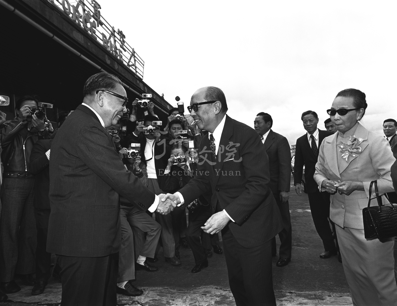 1974年12月18日行政院長蔣經國於機場迎接率團訪問中南美洲尼加拉瓜等4國的副總統嚴家淦伉儷