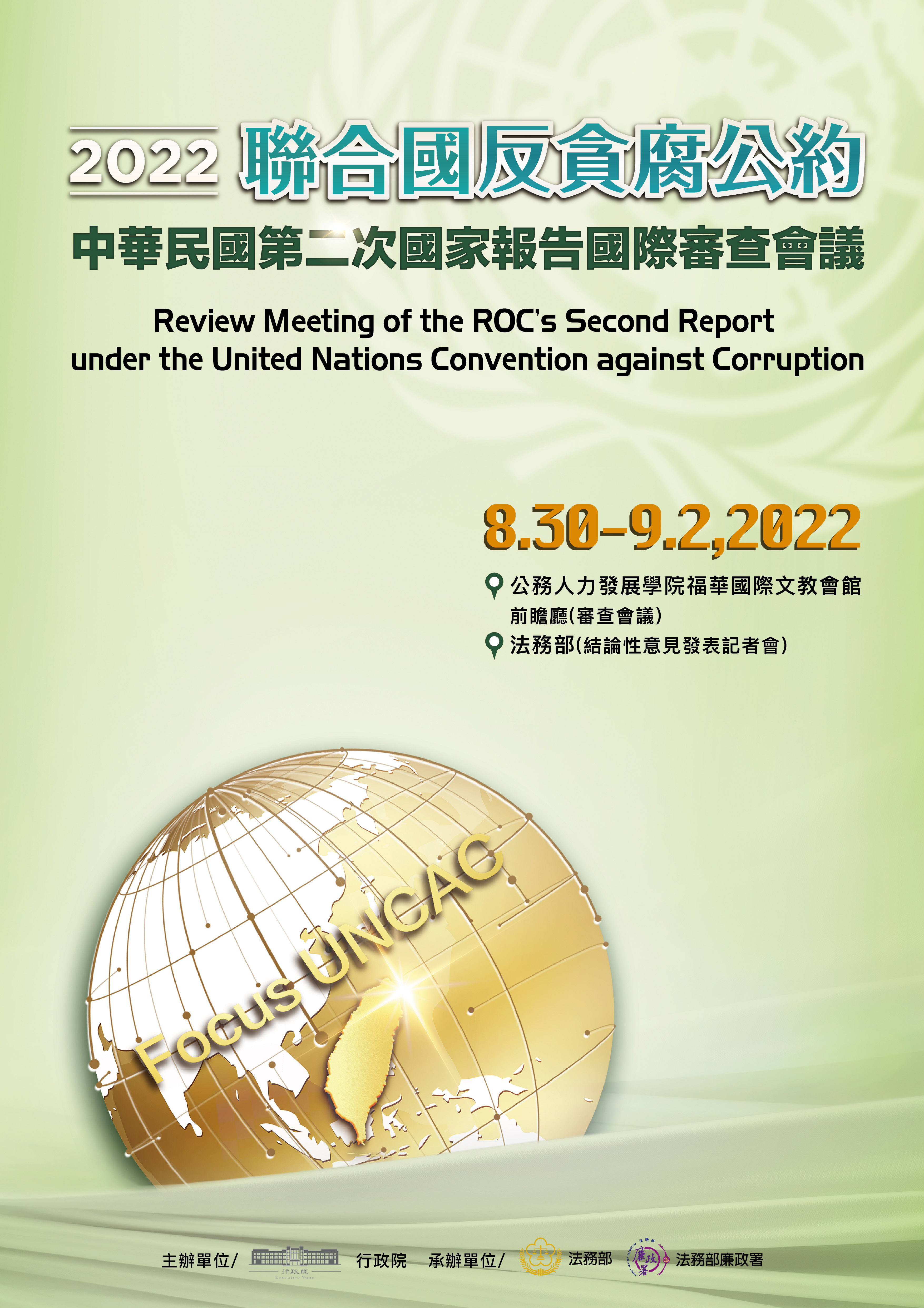 聯合國反貪腐公約第二次國家報告已於111年(以下同)4月20日公布,為接軌全球反貪腐趨勢與國際法制,業於8月30日至8月31日假行政院人事行政總處公務人力發展學院福華國際文教會館前瞻廳舉辦旨揭會議,邀請長期投入國際組織或非政府組織,在反貪腐領域深耕並具影響力之5名專家,來臺進行實地審查,針對臺灣落實公約的執行情形,與政府機關代表進行深入對談,讓國際更瞭解臺灣在捍衛民主與反貪腐普世價值之具體作為與決心。
