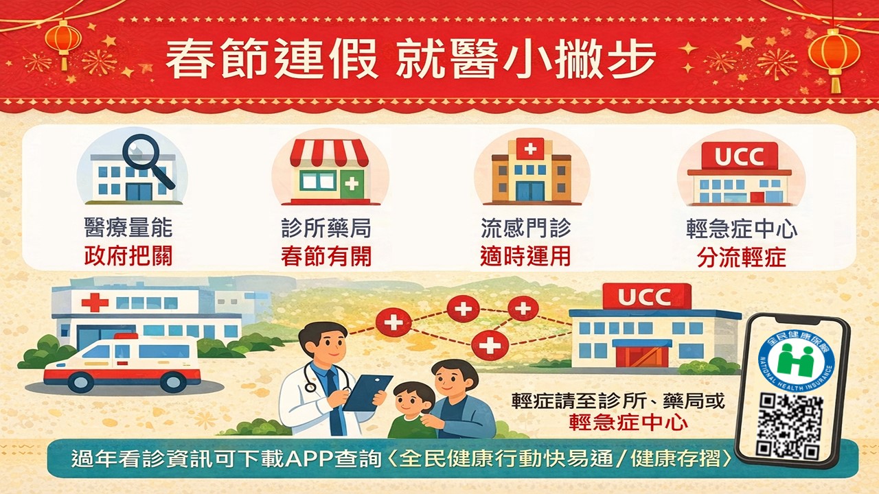 春節期間如為輕症或慢性病需求,請多利用基層診所、特別門診或假日輕急症中心;如遇緊急或重症狀況,急診醫療資源將全力提供協助。衛生福利部將持續監測醫療量能,與地方政府及醫療院所密切合作,確保春節期間醫療服務穩定。