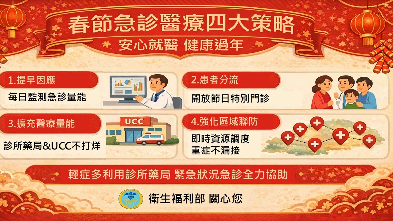 因應春節連假期間民眾就醫需求增加,衛生福利部已提前完成急診及整體醫療量能整備,並啟動跨部會、跨層級應變機制,確保春節期間醫療服務穩定,讓民眾安心就醫、安心過年。