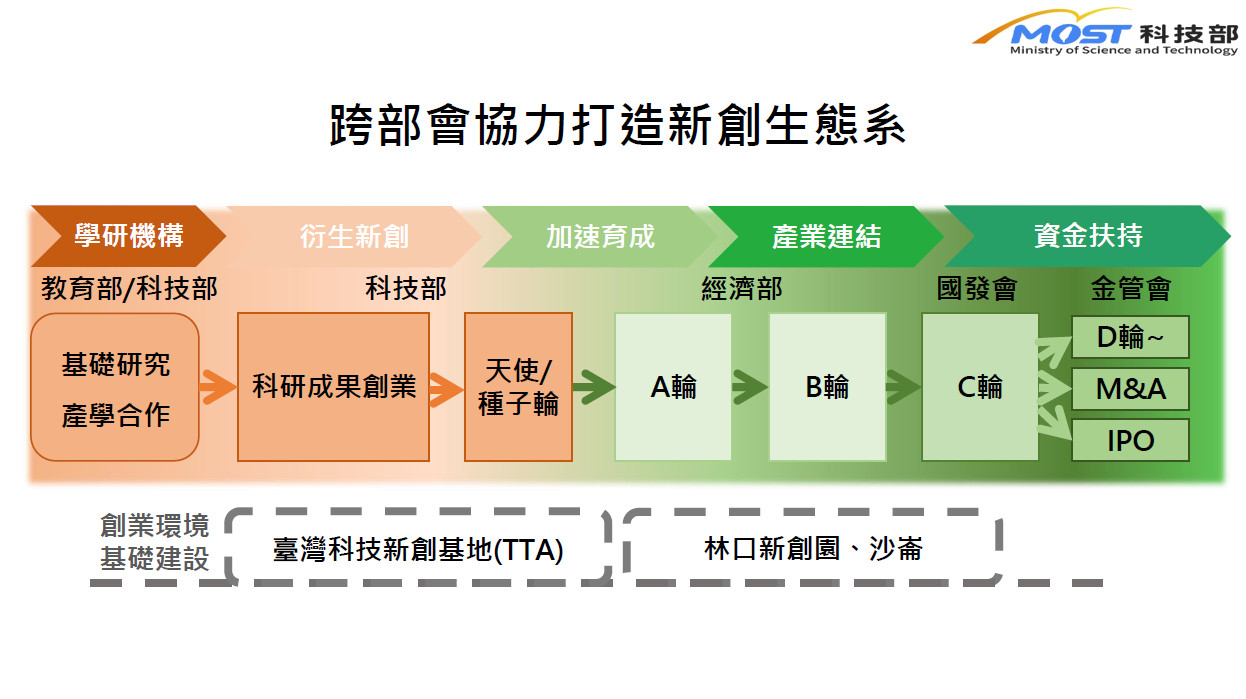 自民國100年起,科技部便積極推動前瞻基礎研究產業化,發掘學界具市場潛力科研成果,協助完成創業準備成立衍生新創公司,以因應現今數位浪潮下之產業轉型需求。截至目前為止,已培育573家科技新創公司,帶動超過4,500人之就業機會,促進精準健康、新農業、IoT到循環經濟等不同領域之產業革新。
