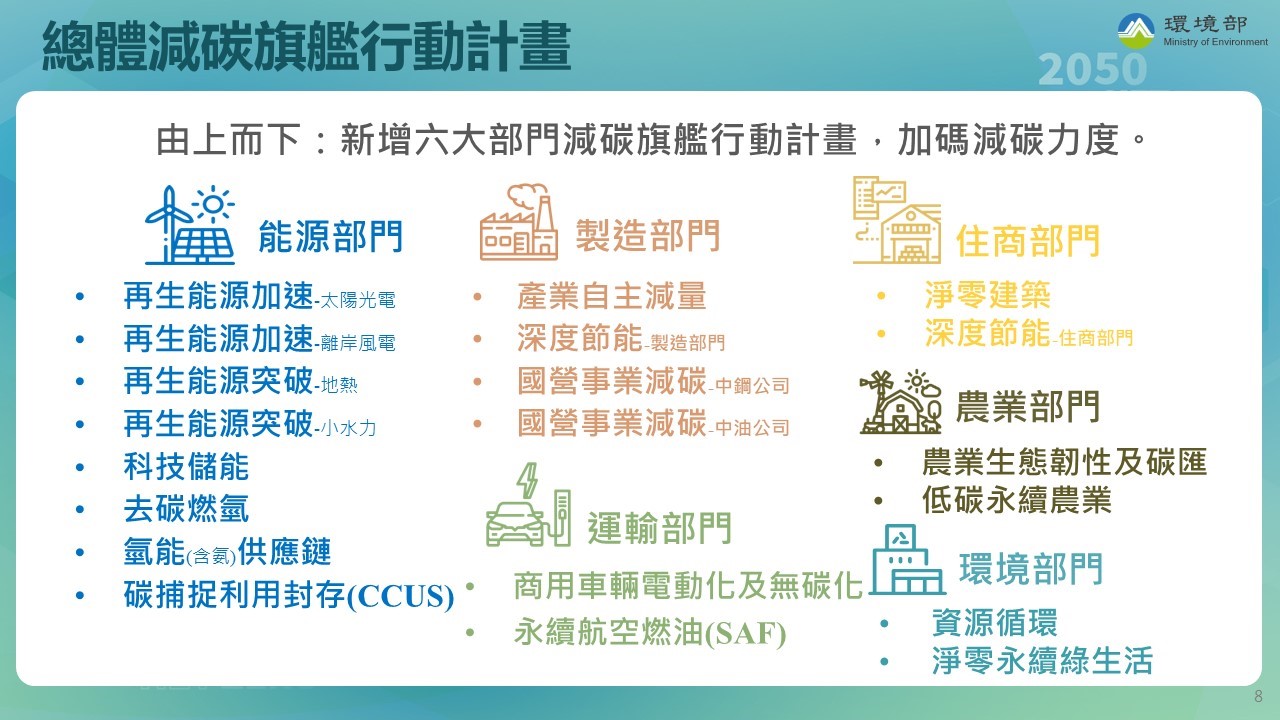 三、為推動國家減碳新目標,擴大啟動社會溝通作業,行政院、環境部與各部會已啟動舉辦一系列社會溝通會議,邀集產、官、學、研及公民團體等利害關係人,共同探討能源、製造、住商、運輸、農業及環境等六大部門提出的20項減碳旗艦行動計畫,迄今已完成「淨零永續綠生活」、「住商部門」、「運輸部門」及「農業部門」減碳旗艦行動計畫社會溝通會議,藉以共創氣候解方,凝聚社會共識。
