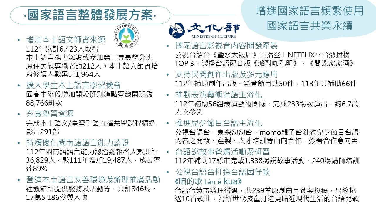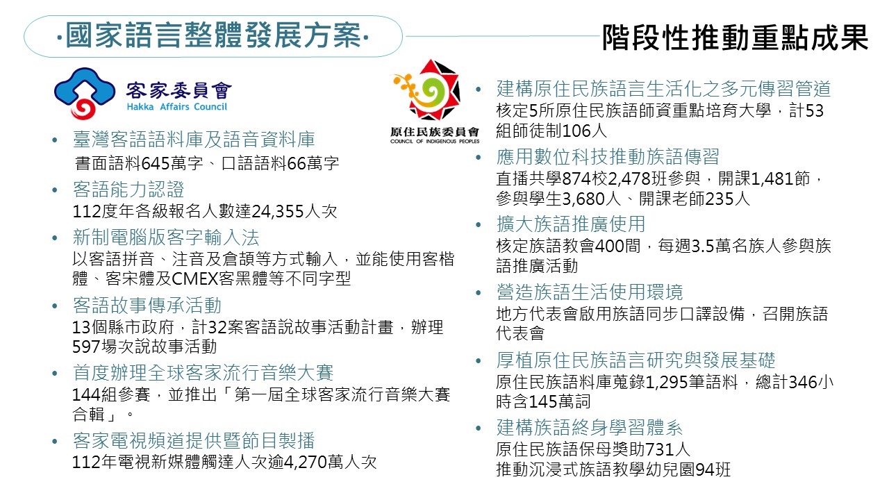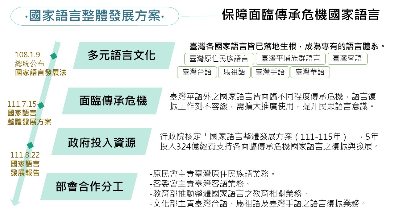 行政院111年7月15日核定文化部、教育部、原住民族委員會、客家委員會共同提出之「國家語言整體發展方案(111-115年)」,5年投入323.9億元經費,支持各面臨傳承危機國家語言之復振與發展。
