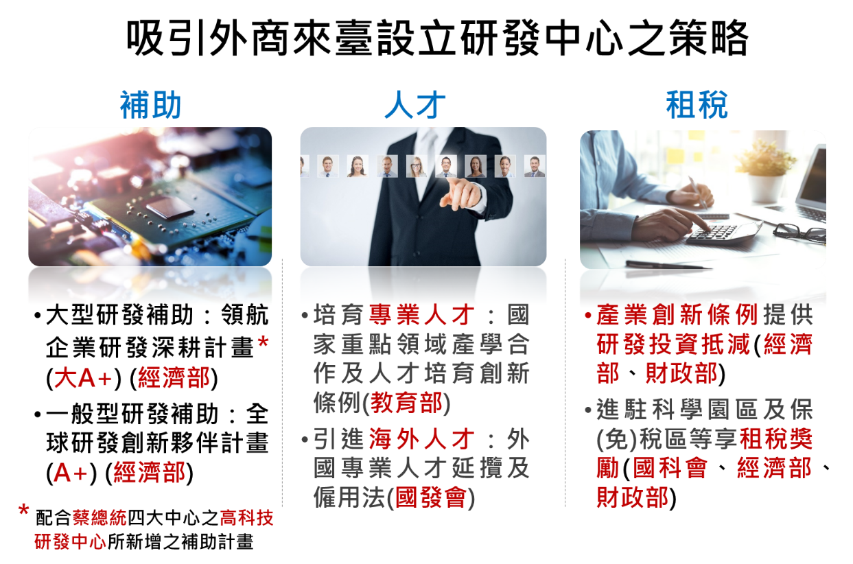 近幾年來在跨部會努力之下,在引進外商來臺研發已有不錯的成果。透過與國際領導廠商的合作,不僅加速提升我國的技術研發實力與全球同步,也達到提升本國研發人才素質的成效。尤其是國際大廠在臺灣從事關鍵技術如半導體之創新研發,攸關全球經濟成長,吸引外商在臺設立研發中心,讓各國利益與臺灣連結,可增進國家安全。