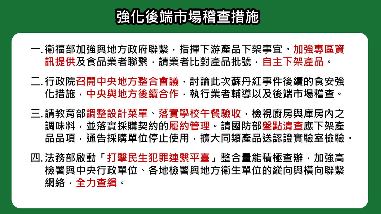 在後市場管理,除強化稽查強度外,也需要食品業者加強自主管理,確認原料之安全性,若有異常應主動通報衛生機關。本院在本周五將邀集相關部會與地方政府衛生單位召開整合會議,討論後續食安強化措施。惟有政府管理、產業自律以及民間參與,三方協力合作才能放大管理效率,政府會持續努力確保國人的食品安全。