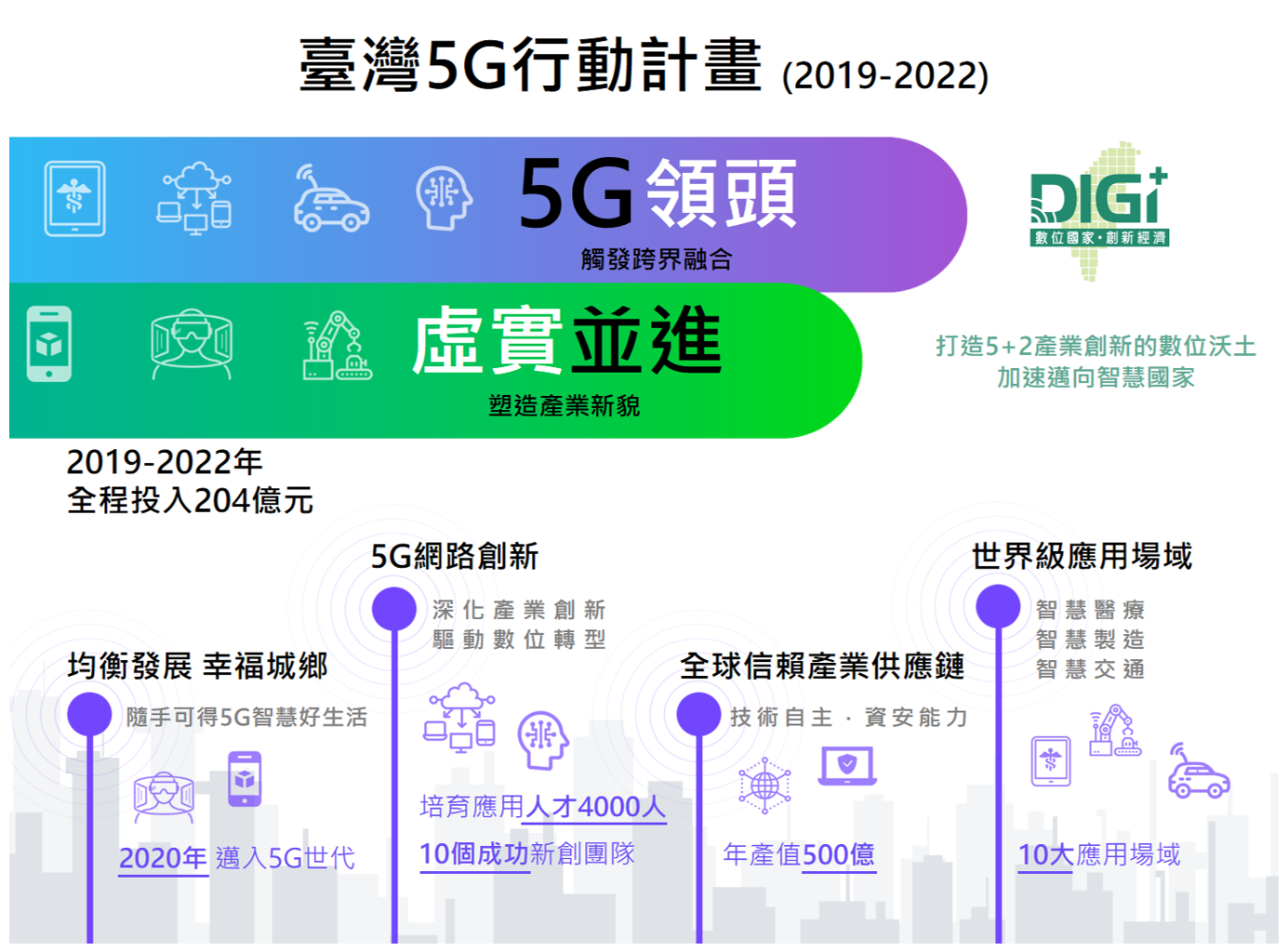 「臺灣5G行動計畫 (2019-2022)」將強化我國既有產業優勢,帶領各界把握5G新世代契機,深化產業創新、驅動數位轉型;後續政府將在聚焦原則下,以鬆綁、創新、實證、鏈結等精神,逐步落實各項施政項目及各階段目標,實現5G智慧生活。