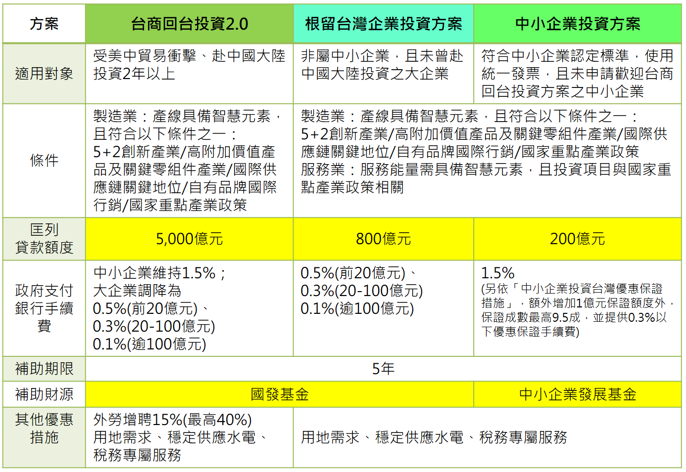 有鑒於美中貿易衝突持續升溫,影響層面逐漸加大,為公平照顧更多廠商,包含根留臺灣廠商及中小企業等有意回臺或在臺加碼投資之廠商,並考量優惠措施之公平性及合理性,略調整原本方案優惠措施,並新增推動「根留臺灣企業加速投資行動方案」及「中小企業加速投資行動方案」。