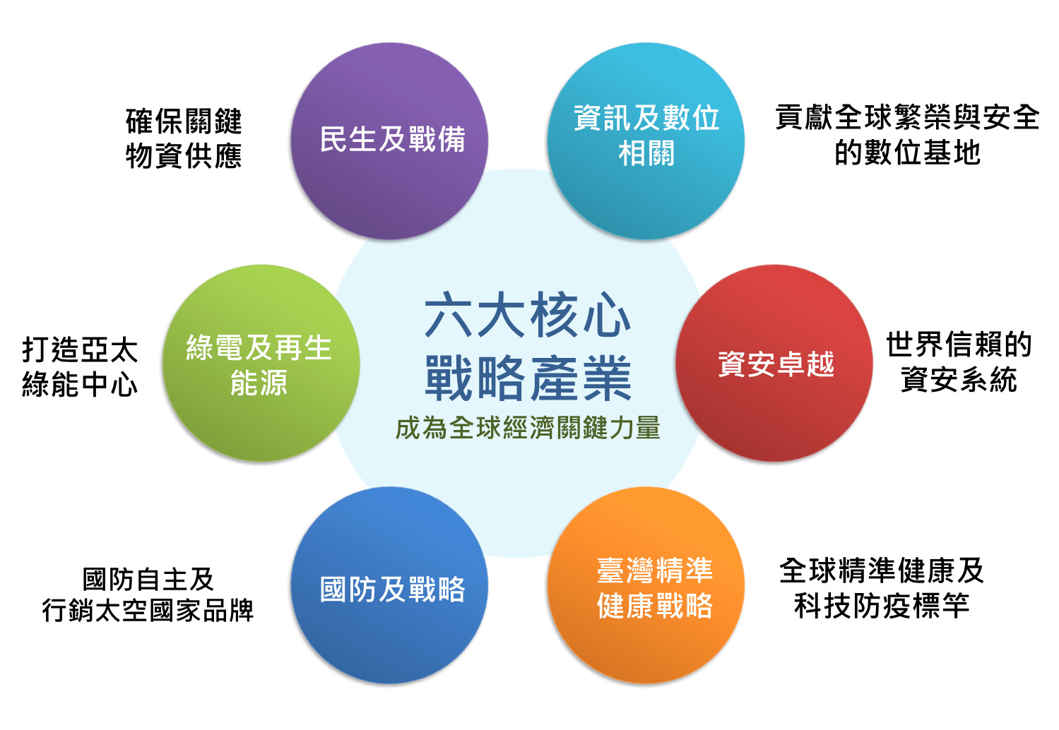 行政院院會今(10)日由國家發展委員會報告「六大核心戰略產業推動方案」整體規劃。六大核心戰略產業是今(109)年520總統在就職演說時宣示推動,包含:資訊及數位、資安卓越、臺灣精準健康、綠電及再生能源、國防及戰略、民生及戰備等六大產業,將以過去推動5+2產業創新為基礎,透過產業超前部署,期使臺灣在後疫情時代,掌握全球供應鏈重組先機。