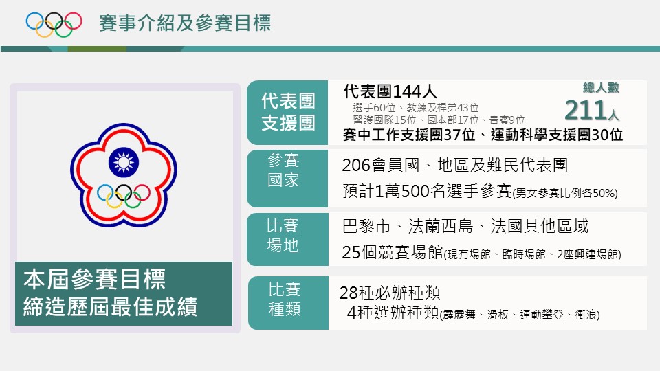 奧林匹克運動會為全世界最高層級且舉辦規模最大之綜合性競技賽會。本屆奧運將於7月26日至8月11日在法國巴黎舉行,我國2024巴黎奧運代表團蓄勢待發,共有60位選手將赴法國爭取16個運動種類的獎牌。