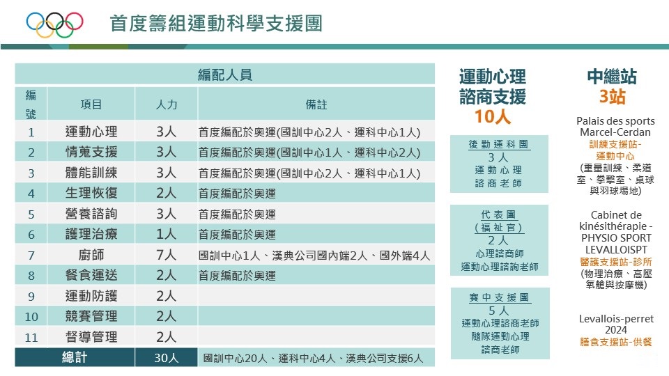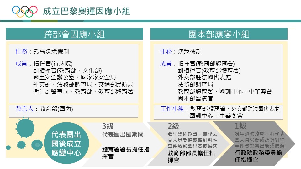 在團隊整備上,教育部體育署組成巴黎與本地兩端的應變小組,提供選手在安全上最完整與即時的支持。此次特別設置安全官,並在法國及國內成立跨部會因應小組及團本部應變小組,即時掌握巴黎奧運籌備會重大安全緊急應變資訊與因應機制,全力支援教練及選手的參賽需求,以最高安全參賽規格,保護每一位代表團成員,協助選手爭取奧運佳績。