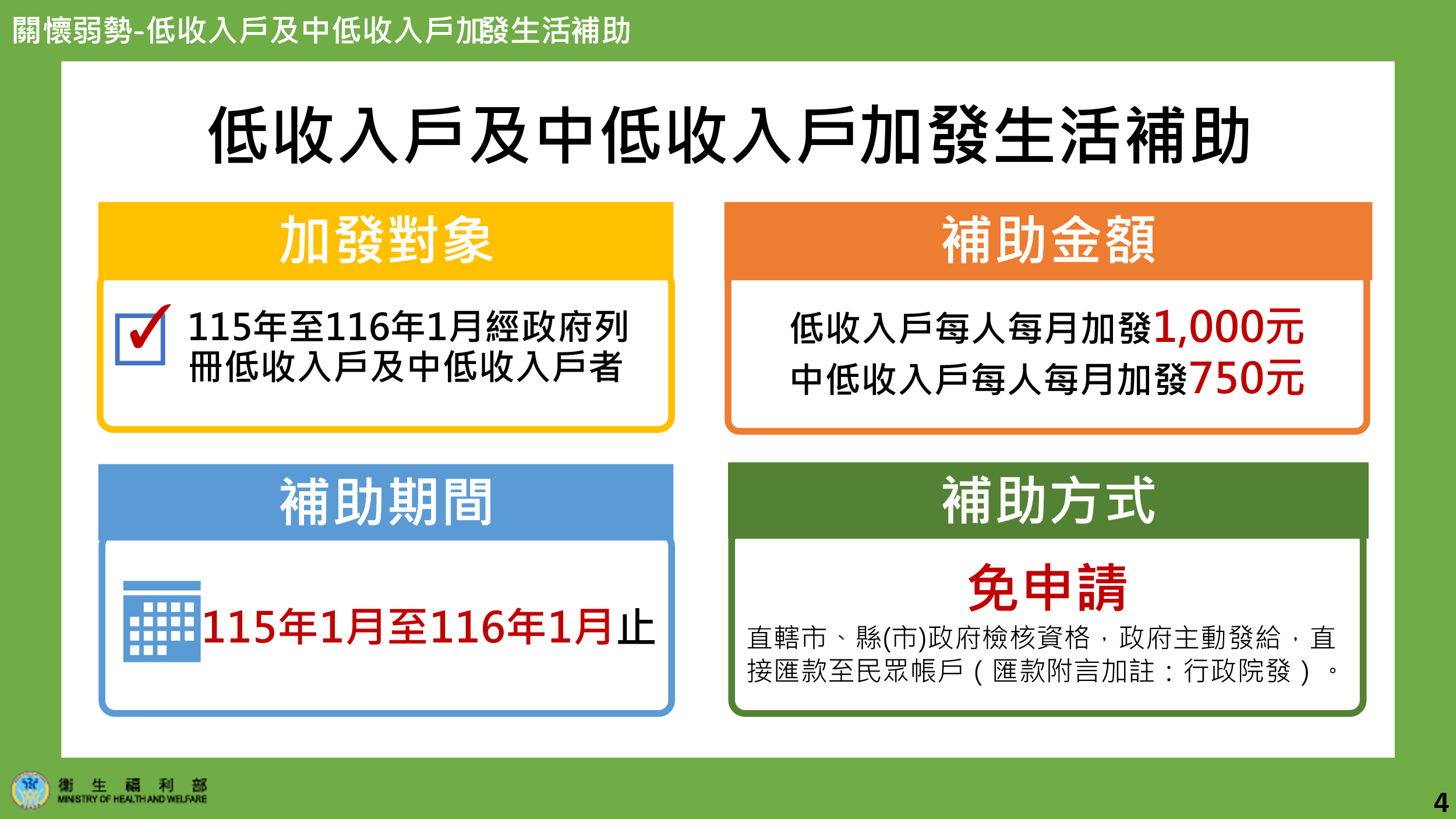 二、為了及時照顧經濟弱勢族群,將自115年1月起至116年1月止,按月加發生活補助金,預計照顧約109萬人,包含: