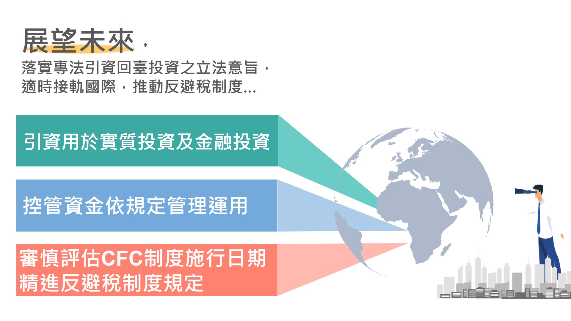 四、財政部進一步表示,依立法院制定資金專法通過附帶決議要求該部應於該專法落日後一年內報請行政院核定受控外國企業(CFC)制度之施行日期,另因應經濟合作暨發展組織(OECD)推動「全球企業最低稅負制」,該部刻審慎評估規劃受控外國企業(CFC)制度之施行日期,並研議精進相關課稅規定,俾接軌國際及維護我國課稅權。