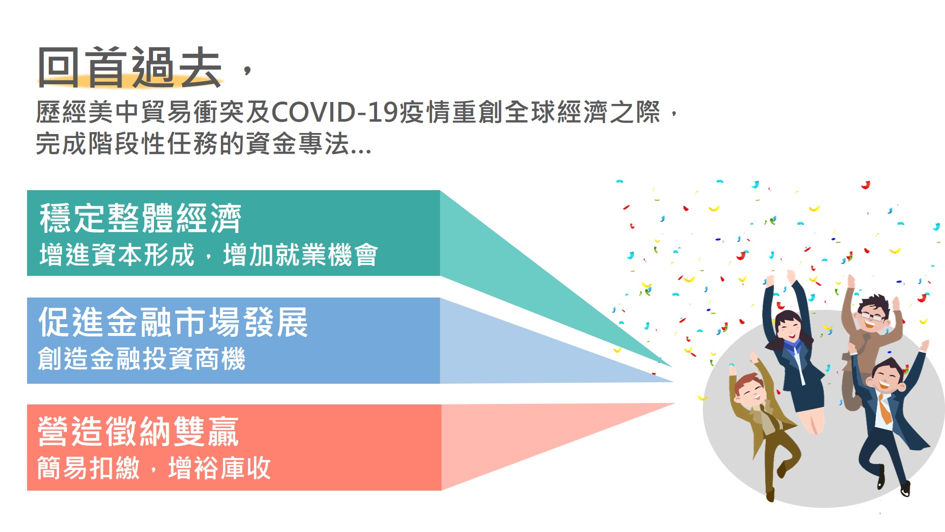 一、為協助臺商因應美中貿易戰調整全球布局,並引導資金回流挹注我國產業及金融市場,自108年8月15日起施行資金專法,提供為期2年之短期租稅措施,至110年8月14日(遇假日順延至16日)申請期限屆滿,計引導新臺幣(下同)3,559億元境外資金申請匯回。