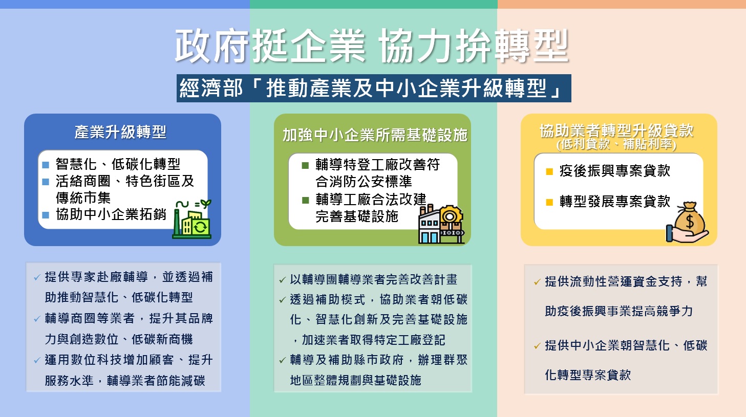 首先,經濟部透過以大帶小及個別廠商模式,提供補助輔導資源,推動產業朝智慧化、低碳化轉型,並引導商圈、特色街區及傳統市集等中小、微型業者朝低碳化、無紙化營運邁進,以及藉由導入數位化工具,協助廠商提升出口競爭力。此外,以輔導團、跨部會平台等機制,協助依工廠管理輔導法申請納管之中小企業轉型升級,及辦理改善基礎設施,使業者得以永續經營,並維持產業發展。另,評估中小企業轉型量能較為不足,也規劃專案貸款,對於有資金需求之廠商提供利息補貼,以加速轉型腳步。