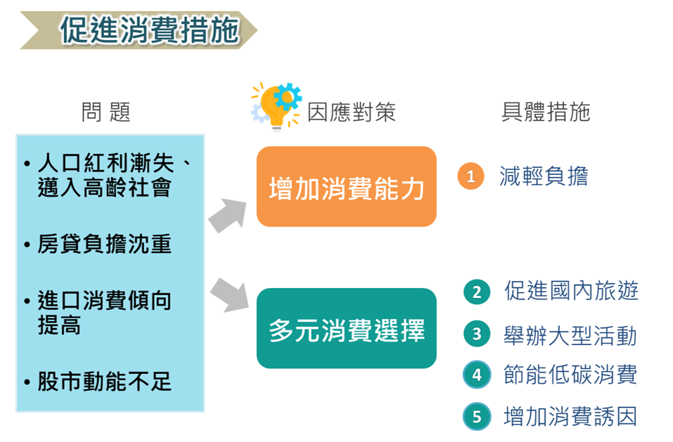 本規劃主要著重在今(2019)年可以執行的對策,從消費與投資這兩大面向驅動內需經濟成長。在消費面主要透過提升民眾消費能力與提供多元消費選擇,活絡國內消費。主要措施包括減輕負擔、促進國內旅遊、舉辦大型活動、鼓勵節能低碳消費及增加消費誘因等五項。