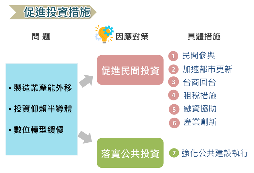考量投資是提振當前景氣與厚植未來成長潛力的重要動能,將分別從促進民間投資、落實公共建設投資二大面向著手。主要措施包括落實歡迎台商回台投資行動方案、加速推動都市更新及危老屋重建、優化投資環境、激勵產業創新、吸引民間參與公共建設、強化公共建設執行。