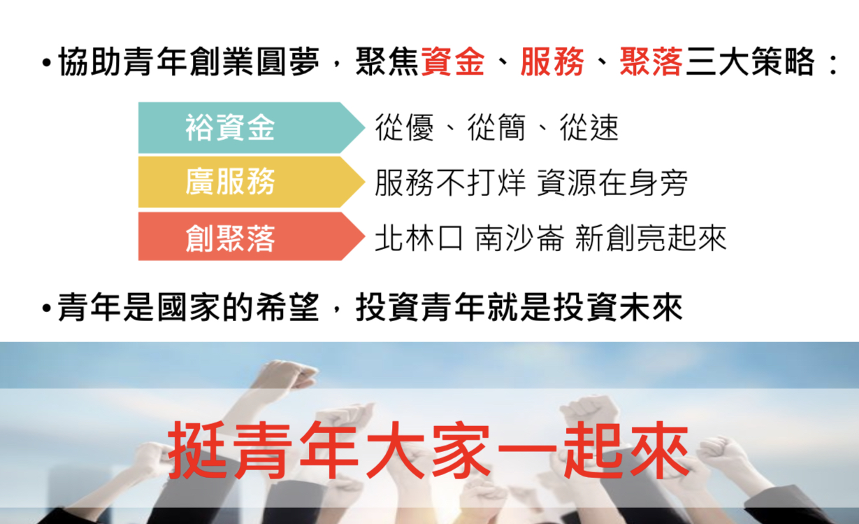 裕資金:對於100萬元以下小額青創貸款,指定專責銀行,以表格申請取代計畫書,7日內核貸,保證成數最高100%,前5年由政府補助1.67%利息,以更簡便、更效率之方式,協助青年取得創業資金。