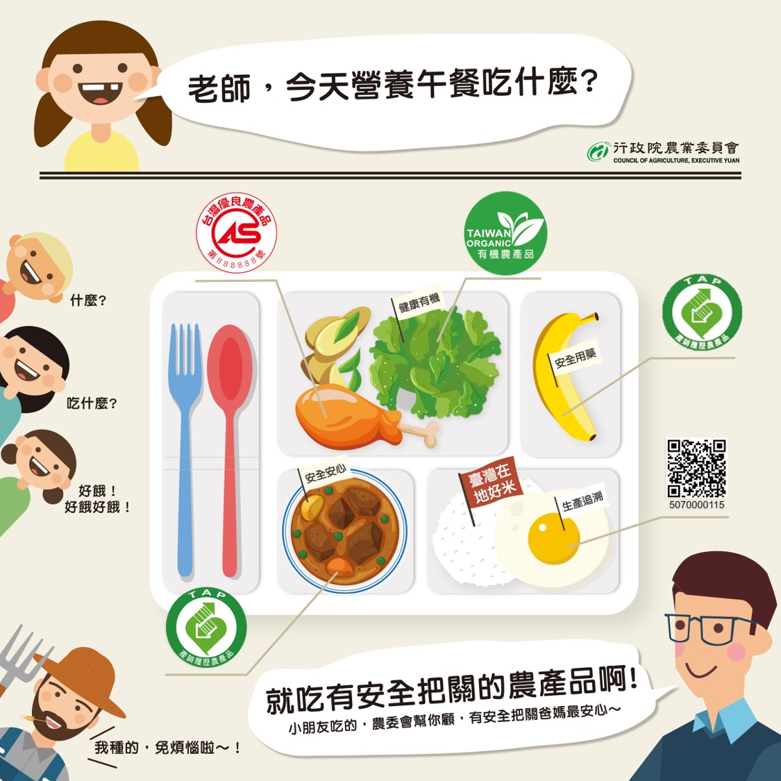 為落實「食安五環」政策,照顧國中小學童的飲食健康,食用優質安全之國產農產品,讓全國家長更安心與放心,由教育部及農委會共同推動學校午餐使用在地食材政策,鼓勵學校午餐選用有機、產銷履歷、臺灣優良農產品等標章或具有臺灣農產品生產追溯標示QR Code之生鮮食材,強化學校午餐食材安全性,培養在地低碳飲食習慣與食農生活教育。