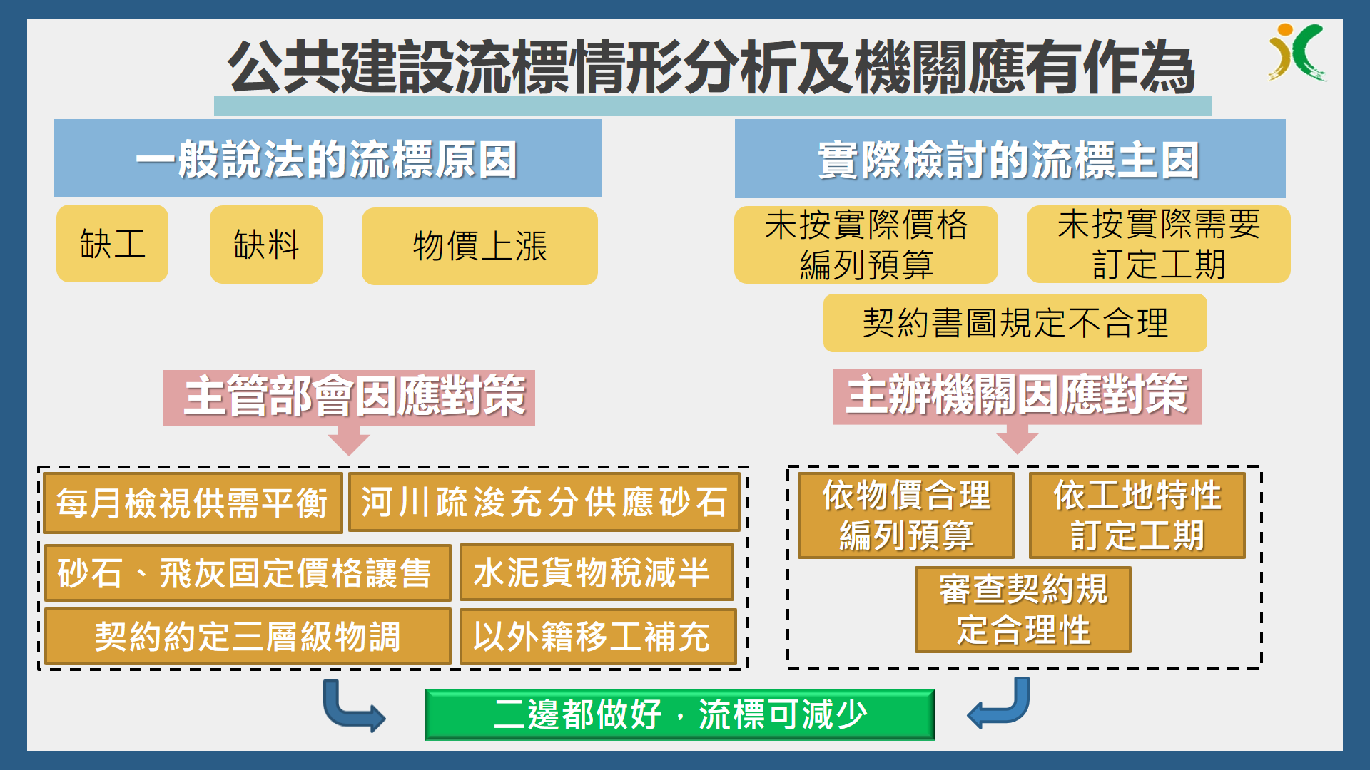 工程會並統計9成以上案件順利決標,就部分未能順利決標的案件,工程會自107年以來檢討300餘個流標案件,歸納發現尚存有以下3個個案因素:未按實際價格編列預算、未按實際需要訂定工期、契約書圖規定不合理,並已提出因應對策,機關招標時應就個案特性,於工程的全生命週期各階段納入考量,落實下列因應對策: