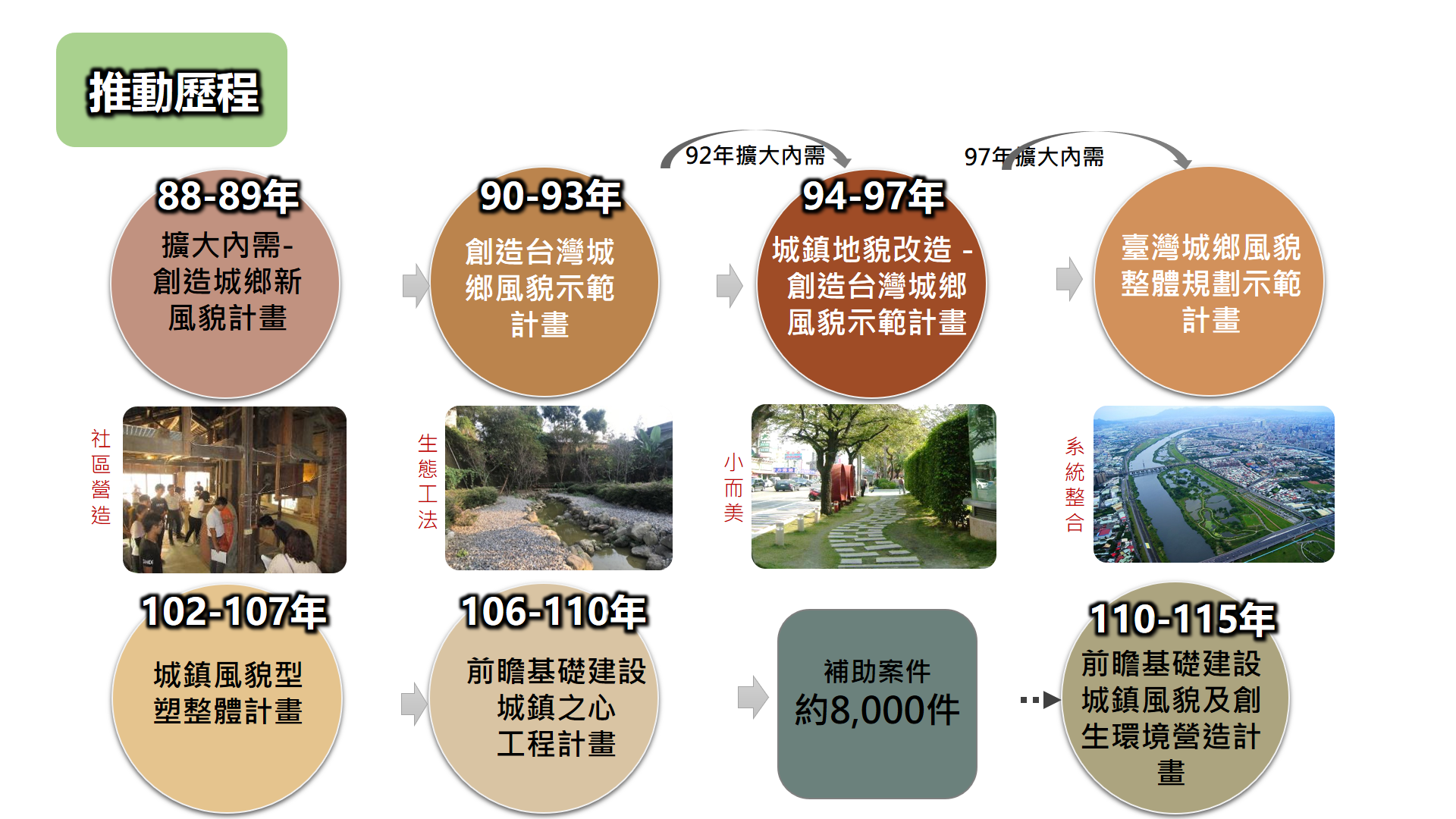 過去20年來共推動5期的4年中長程計畫,協助地方政府執行城鄉景觀改造計畫約8,000餘件,從過去的「小而美」針疚式景觀改造至當前的「跨域整合」推動策略,已在各地創造出豐碩成果,例如宜蘭河與舊城再生、桃園林口線路廊活化、新竹步行城市、台南月津港水綠縫合、屏東殺蛇溪與萬年溪藍綠帶系統整合,烈嶼戰地文化保存與小鎮創生、連江縣閩東傳統聚落保存與活化等等,都是長期來透過城鄉風貌計畫補助經費,將地方所特有的自然、人文及生活文化景觀,一點一滴逐步打造出相當具有代表性的案例。