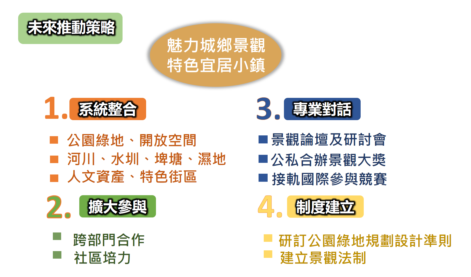未來將透過計畫競爭方式,鼓勵地方政府落實跨域合作,並透過社區參與,提出永續城鄉的整體發展願景,推動水綠環境、公共開放空間、人文資產及特色街區等跨部門整合行動方案,並持續與景觀專業界溝通對話,不斷精進景觀設計的新技術與新內涵,營造與環境共生、尊重人性尺度、具質感品味的城鄉環境。