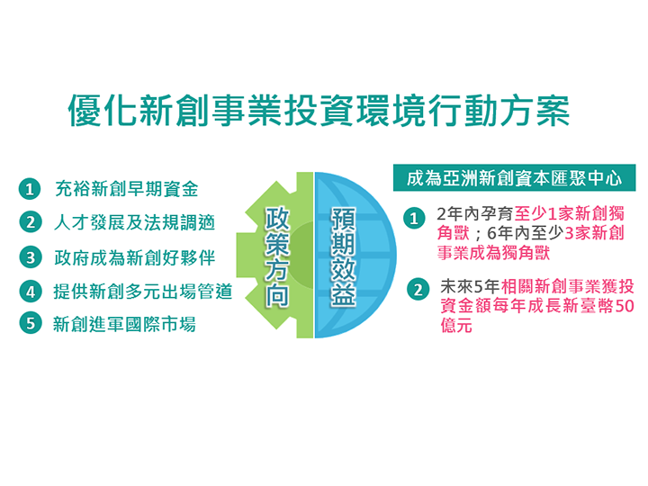 該方案以在2年內孕育至少1家獨角獸新創事業、帶動未來5年相關新創事業獲投資金額每年成長新臺幣50億元為目標。將加強提升臺灣在國際新創圈能見度,吸引國際新創資金及資源來臺,同時為國內年輕人樹立標竿,進而鼓勵渠等積極投入創新創業,期使臺灣新創事業投資環境逐步優質化,建構完整生態系,並成為亞洲新創資本匯聚中心。