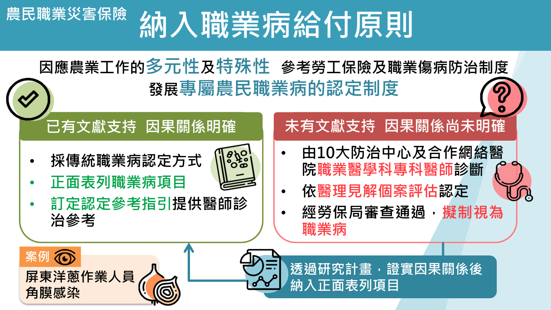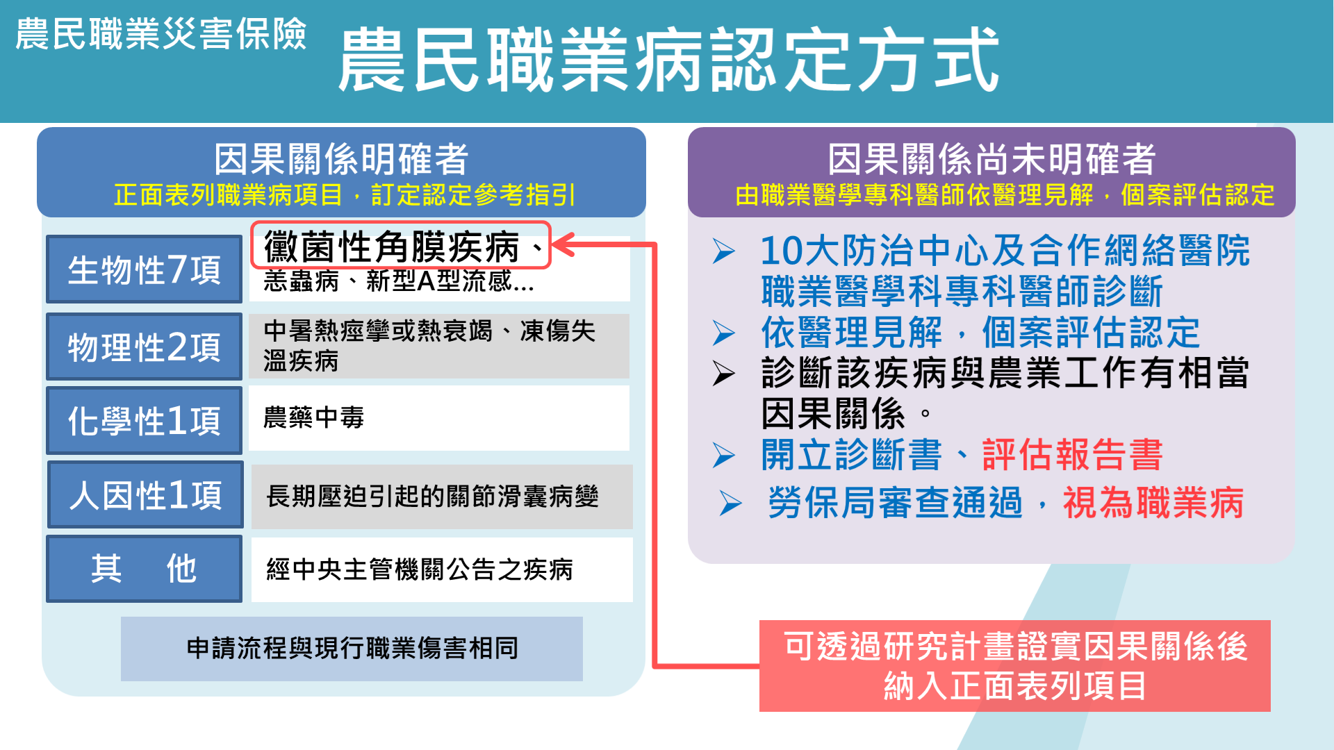 另外,「擬制視為職業病」部分,因尚未獲有流行病學具體共識,屬正面表列以外的其他疾病項目,將由各區職業傷病防治中心及合作網絡醫院的職業醫學科專科醫師依醫理見解,協助個案評估,如經勞工保險局(下稱勞保局)審查通過後,擬制視為職業病,提供農民職災保險給付。