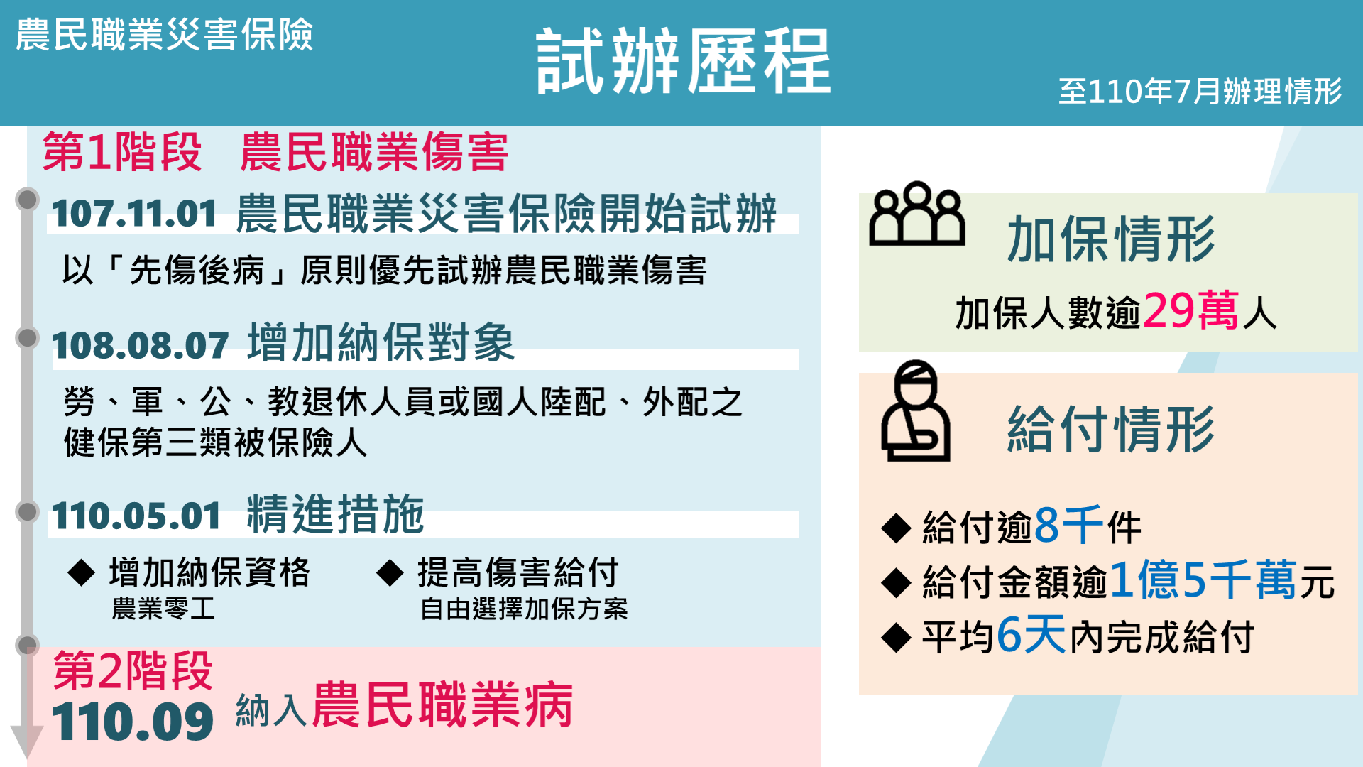 行政院農業委員會(下稱農委會)於107年11月1日開始試行辦理農民職業災害保險 (下稱農民職災保險),試辦期間採「先傷後病」,第一階段優先試辦因果關係較為明確的「職業傷害」,108年8月7日及110年5月1日起陸續完成擴大納保對象;及提高傷害給付等精進措施。第二階段110年9月10日起將職業病納入農民職災保險給付,農民職災保險再升級,讓農民職業安全保障範圍更為完整。
