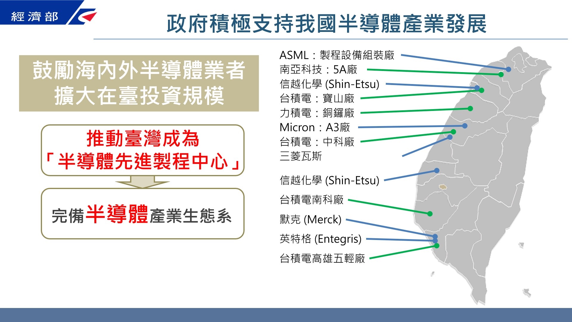 作為全球半導體生產重鎮的臺灣,110年臺灣半導體產業產值在全球位居第二、晶圓代工與IC封測全球第一、IC設計全球第二,上中下游供應鏈完整,深具聚落優勢。為鞏固全球半導體產業韌性,我國政府積極支持半導體產業,除支持臺灣半導體業者繼續在臺發展,並提供政策誘因吸引國際半導體製造、設備與材料大廠來臺投資。近三年來,國內外半導體大廠在臺設廠投資規模已超過3.5兆元新臺幣,成果斐然。