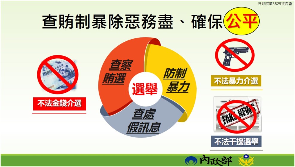 選舉活動接近最後階段,內政部警政署將持續與各選務及檢調機關分進合擊,針對「賄、賭、外、假、安」等方面嚴加查緝,包含查察賄選、選舉賭盤、境外資金、假訊息等不法擾亂選舉,並持續掃蕩黑道幫派、槍枝暴力等危害選舉安全,營造乾淨選舉風氣。