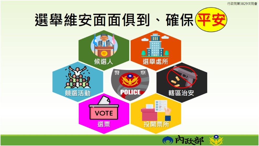 維護選舉公平、公正,保護候選人安全,警察全力以赴,內政部警政署及各警察機關將秉持「依法行政、行政中立」原則,維護選舉之「平安」、「平順」、「平穩」,確保任務圓滿達成。