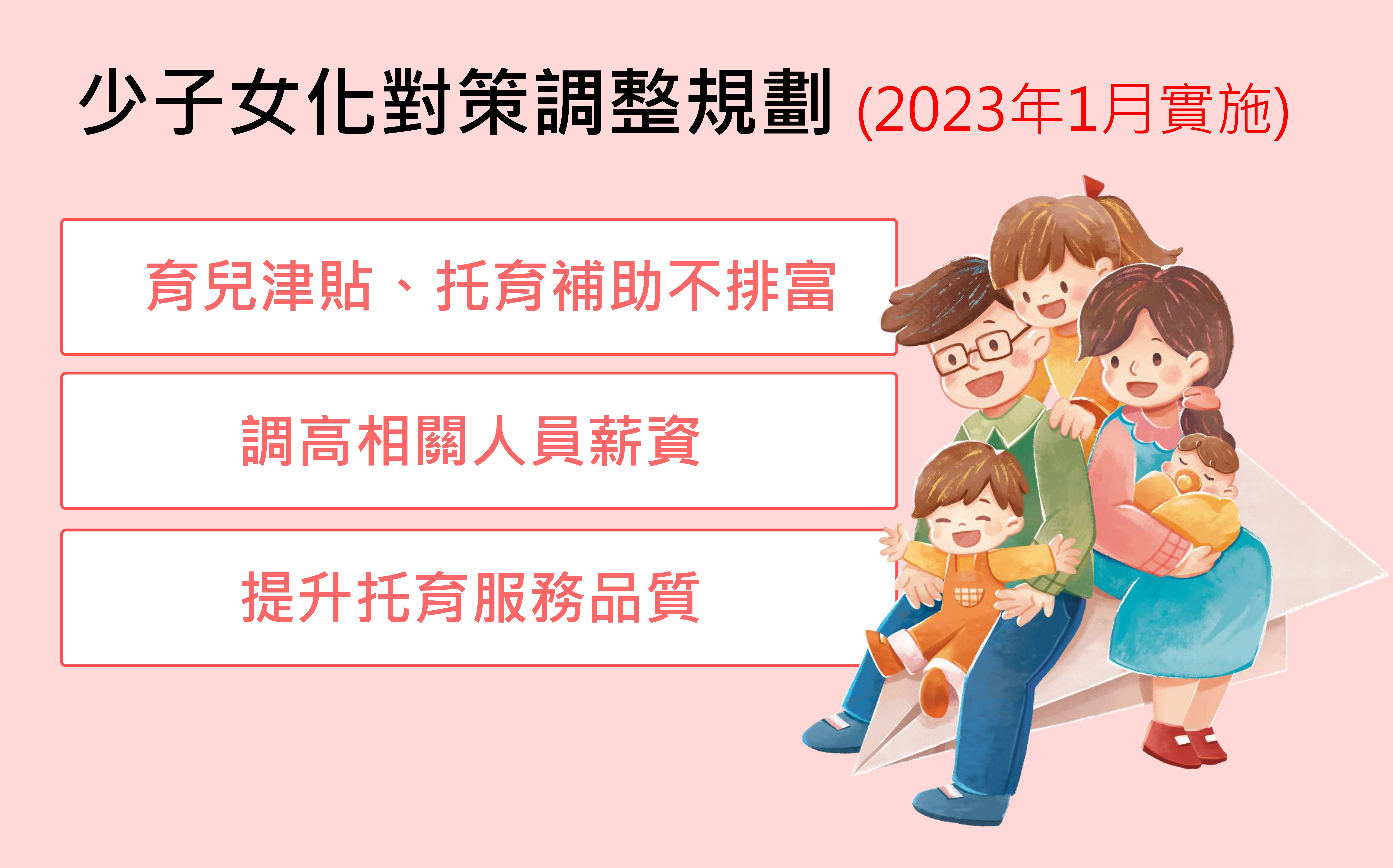 為營造友善育兒環境,減輕家長經濟負擔,並提升托育服務品質,本院將自2023年1月起推動少子女化對策之精進調整措施如下: