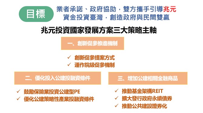 為引導資金投入國家建設,政府啟動「兆元投資國家發展方案」,透過推進創新促參推進機制、優化投入公共建設投融資條件、增加公共建設相關金融商品等三大策略主軸,並藉由設立院層級促參專案會議,架構公私協力平臺,政府與民間相互承諾,雙向協議兆元資金投資臺灣,推動發展國家建設。