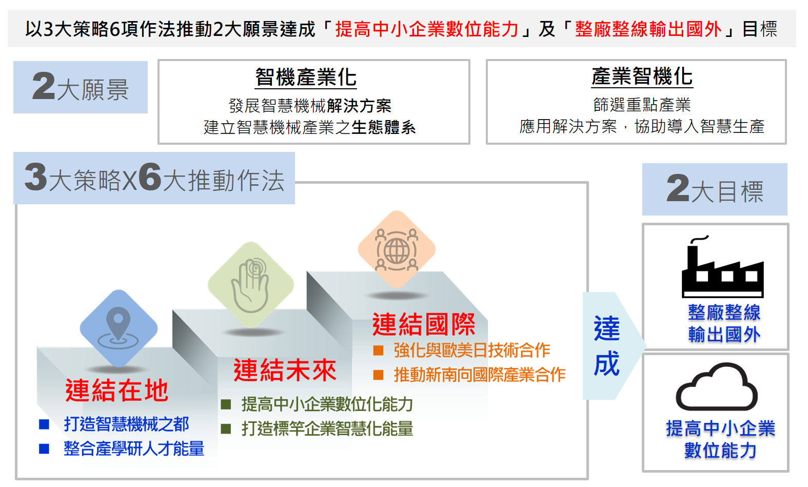 2.智慧機械產業推動方案:以3大策略推動2大願景達成「提高中小企業數位能力」及「整廠整線輸出國外」目標。