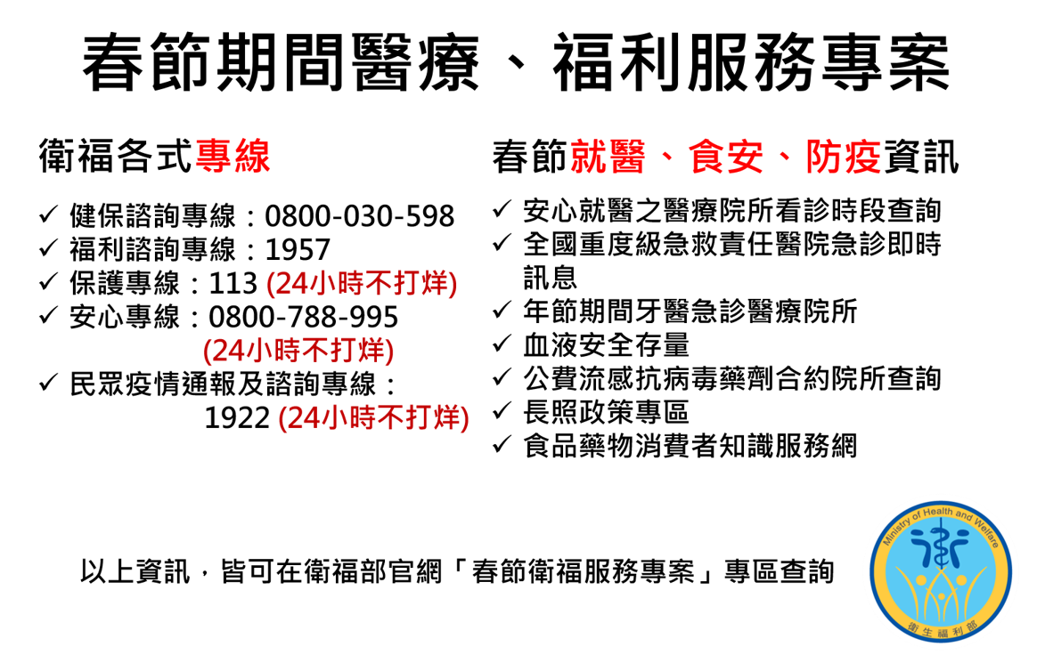農曆春節將至,為維護全體國民之健康與福祉,使各項衛生與福利服務不中斷,衛生福利部推動「春節期間醫療、福利服務專案」,陪伴民眾暖心過好年: