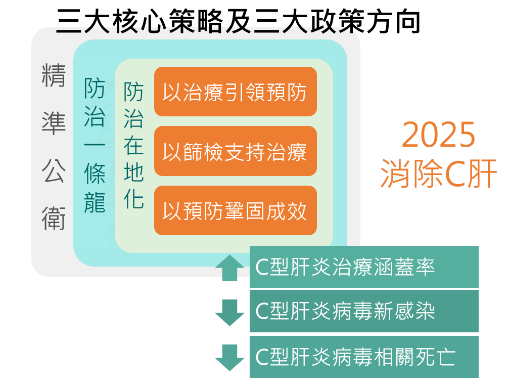 C型肝炎(以下簡稱C肝)是僅次於B肝的肝病第二號殺手,衛生福利部於106年以國內人口推估約有40萬名慢性C肝病人,其中近8萬人已使用干擾素治療並成功清除C肝病毒,但仍有約32萬名病人需要治療。WHO宣示2030年消除病毒性肝炎,我國已訂定於2025年以C肝口服新藥治療25萬名C肝病人,預估減少國內80%的C肝病人,並可提前達到WHO之C肝消除目標。為降低C肝對公共衛生與民眾健康的威脅,將持續積極推展下列各項防治策略: