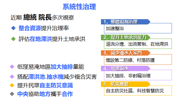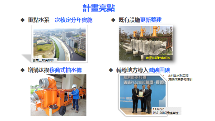 比照臺南市三爺溪排水整治模式,針對重點水系一次核定、分年實施,集中資源完成流域整體改善且併辦水域環境改善。並針對既有設施如護岸、水門及抽水站更新整建,以維持前期治水成效。同時考量工程有其極限,透過移動式抽水機增購、汰換等非工程措施,提升防救災及調度支援效能。另外就淨零排放方面,輔導地方政府參考經濟部水利署水利工程減碳作業參考指引導入減碳固碳。
