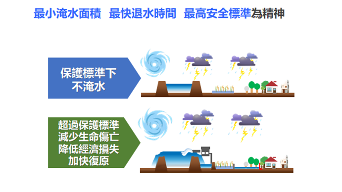 近年因氣候變遷造成極端降雨頻頻發生,降雨往往超過設計保護標準,本計畫以「有水無災」為願景,在保護標準下不淹水;超過保護標準時,須減少生命傷亡、降低經濟損失、加快復原。以最小淹水面積、最快退水時間、最高安全標準為精神,提出系統性治理五大策略,包含加速整體規劃治理、推動逕流分擔、在地滯洪、村落防護、加大抽排。