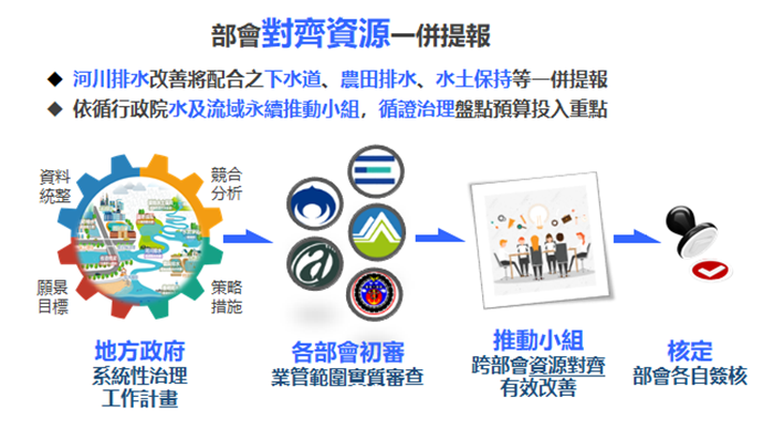 本計畫執行由地方政府提出系統性治理工作計畫,包含河川排水、下水道及需配合之農田排水、水土保持、國有林地、省道橋梁、養殖排水等水患改善及水域環境改善等,依評核機制專業審查,透過流域循證治理方式,蒐集流域各面向問題分析,進行流域整體問題分析,由上而下規劃流域永續願景目標,定期盤點流域課題研擬治理策略、經費及建議優先順序,透過精準分配資源及預算執行,同時滾動檢討調整政策方向,由部會治理提升至國家治理。
