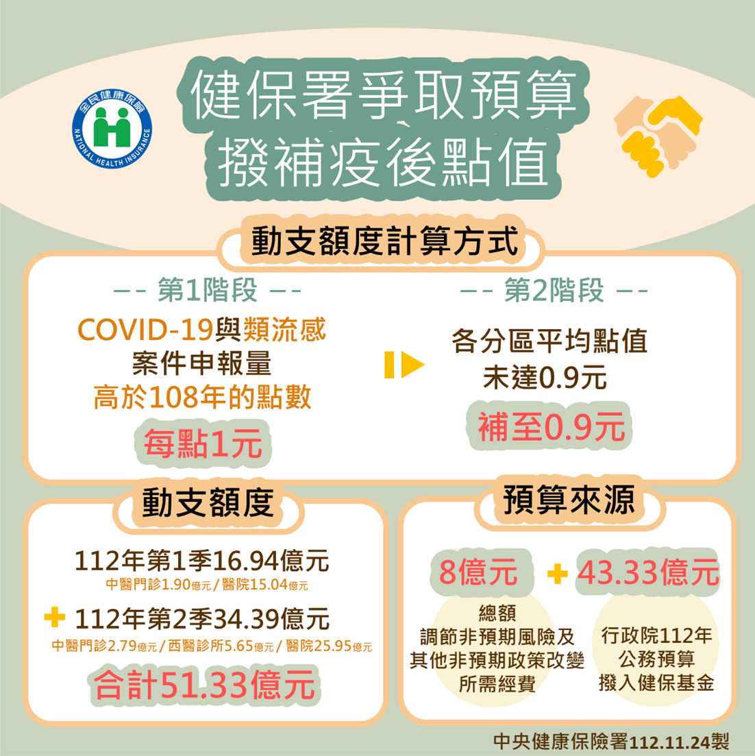 一、COVID-19回歸健保總額之影響:考量疫情指揮中心宣布自今(112)年3月20日起COVID-19降級,醫療費用回歸改由健保支應,及疫後就醫次數波動增加,導致健保點值下降,衛福部健保署研議就前開原因所產生之影響提案至今年11月15日健保會委員會議,依前開動支程序爭取動支112年「調節非預期風險及其他非預期政策改變所需經費」項目預算。