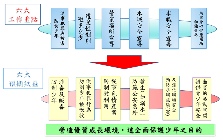 今年度青春專案以「淨化妨害青少年成長環境」、「防制青少年被害」及「擴大犯罪預防宣導」為三大工作主軸,並規劃「防制少年從事犯罪與被害」、「避免兒少遭受性剝削」、「水域安全宣導」、「求職安全宣導」、「營業場所安全」及「加強查訪妨害身心健康場所」為六大工作重點,並自6月開始執行,採取多元化之犯罪預防宣導方式,希望在暑假開始前,即告知少年學子如何遠離危害,以預防偏差行為及被害,營造優質青少年成長環境。