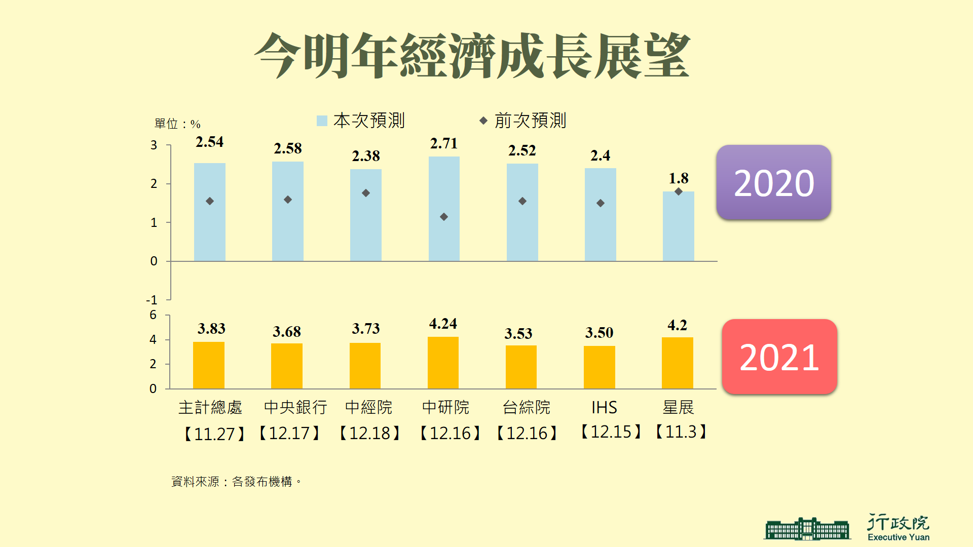 今(2020)年11月景氣燈號分數創9年半來新高,指標持續上升,反映國內經濟穩定成長;臺股指數屢創30年新高,且外資持股占總市值比例達44%,也締造歷史高點。據本院主計總處預估,今年全年經濟成長率為2.54%,明(2021)年將可達3.83%,另外包括中經院、中研院等機構,均調高對我國今年經濟成長率的預測,相當看好臺灣明年經濟表現。